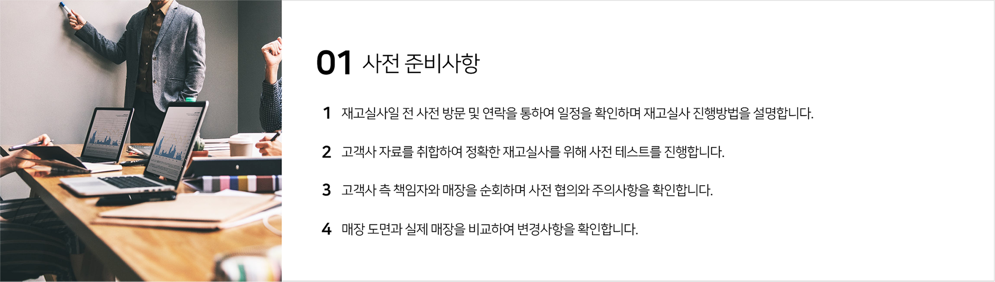 1 재고실사일 전 사전 방문 및 연락을 통하여 일정을 확인하며 재고실사 진행방법을 설명합니다.