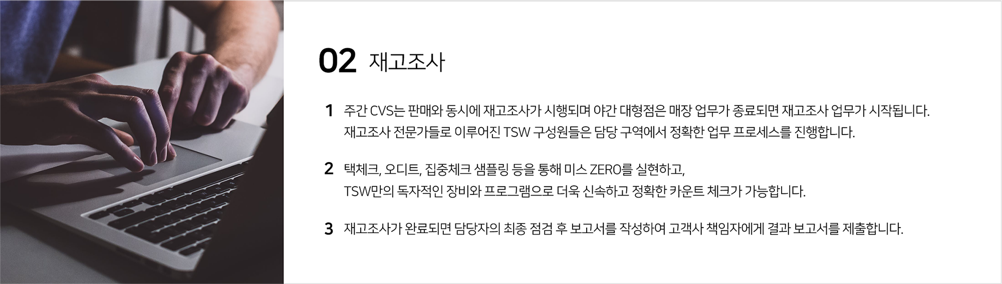 1 주간 CVS는 판매와 동시에 재고조사가 시행되며 야간 대형점은 매장 업무가 종료되면 재고조사 업무가 시작됩니다. 재고조사 전문다글로 이루어진 TSW 구성원들은 담당 구역에서 정확한 업무 프로세스를 진행합니다.
